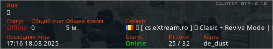 Играет на Counter Strike 1.6 сервере. Страна: РумынияПервый раз замечен 17:08 18.08.2025
