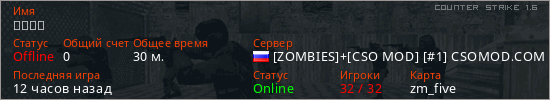 Играет на Counter Strike 1.6 сервере. Страна: РоссияПервый раз замечен 10:36 16.01.2026