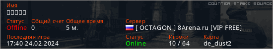 Играет на Counter Strike Source сервере. Страна: РоссияПервый раз замечен 17:35 24.02.2024