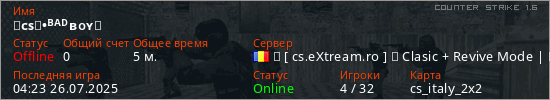 Играет на Counter Strike 1.6 сервере. Страна: РумынияПервый раз замечен 02:28 08.01.2025