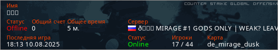 Играет на Counter Strike Global Offensive сервере. Страна: РоссияПервый раз замечен 17:57 10.08.2025