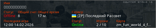 Играет на Counter Strike 1.6 сервере. Страна: УкраинаПервый раз замечен 02:14 14.02.2026