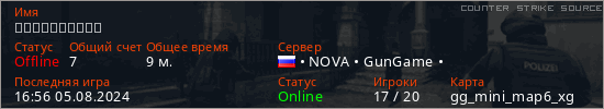 Играет на Counter Strike Source сервере. Страна: РоссияПервый раз замечен 15:48 05.08.2024
