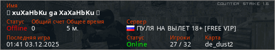 Играет на Counter Strike 1.6 сервере. Страна: РоссияПервый раз замечен 01:37 03.12.2025
