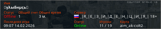 Играет на Counter Strike 1.6 сервере. Страна: РоссияПервый раз замечен 09:07 14.02.2026