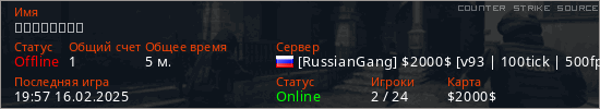 Играет на Counter Strike Source сервере. Страна: РоссияПервый раз замечен 19:55 16.02.2025