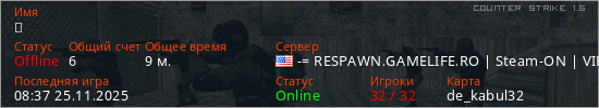 Играет на Counter Strike 1.6 сервере. Страна: СШАПервый раз замечен 04:16 18.08.2025