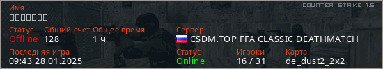 Играет на Counter Strike 1.6 сервере. Страна: РоссияПервый раз замечен 21:07 26.01.2025