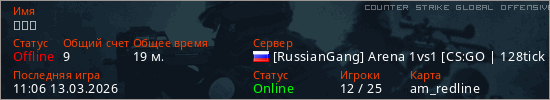 Играет на Counter Strike Global Offensive сервере. Страна: РоссияПервый раз замечен 10:46 13.03.2026