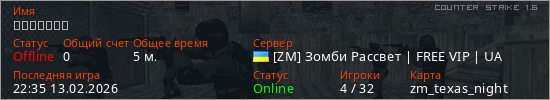 Играет на Counter Strike 1.6 сервере. Страна: УкраинаПервый раз замечен 22:31 13.02.2026