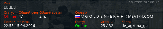Играет на Counter Strike 1.6 сервере. Страна: РоссияПервый раз замечен 19:13 02.04.2026