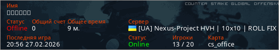 Играет на Counter Strike Global Offensive сервере. Страна: УкраинаПервый раз замечен 05:03 26.02.2026