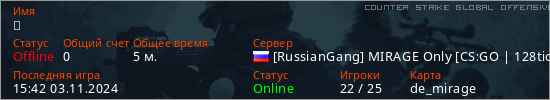 Играет на Counter Strike Global Offensive сервере. Страна: РоссияПервый раз замечен 15:17 03.11.2024