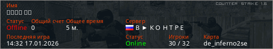 Играет на Counter Strike 1.6 сервере. Страна: РоссияПервый раз замечен 14:11 17.01.2026