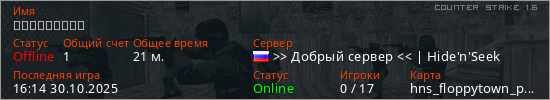 Играет на Counter Strike 1.6 сервере. Страна: РоссияПервый раз замечен 16:05 21.08.2025