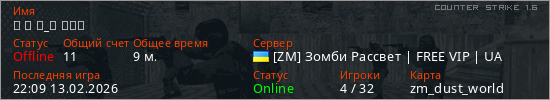 Играет на Counter Strike 1.6 сервере. Страна: УкраинаПервый раз замечен 21:42 13.02.2026