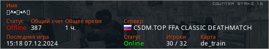 Играет на Counter Strike 1.6 сервере. Страна: РоссияПервый раз замечен 10:02 04.07.2022