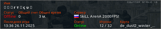 Играет на Counter Strike 1.6 сервере. Страна: РоссияПервый раз замечен 13:36 26.11.2025