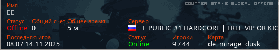 Играет на Counter Strike Global Offensive сервере. Страна: РоссияПервый раз замечен 07:38 14.11.2025