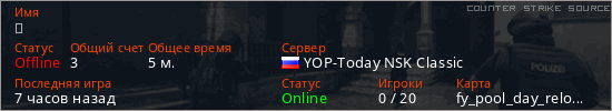 Играет на Counter Strike Source сервере. Страна: РоссияПервый раз замечен 12:14 15.04.2026
