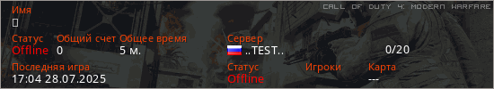 Играет на Call of Duty 4: Modern Warfare сервере. Страна: РоссияПервый раз замечен 16:45 28.07.2025