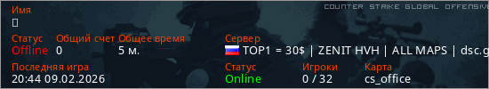 Играет на Counter Strike Global Offensive сервере. Страна: РоссияПервый раз замечен 20:42 09.02.2026