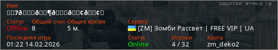 Играет на Counter Strike 1.6 сервере. Страна: УкраинаПервый раз замечен 01:09 14.02.2026