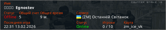 Играет на Counter Strike 1.6 сервере. Страна: УкраинаПервый раз замечен 20:28 13.02.2026