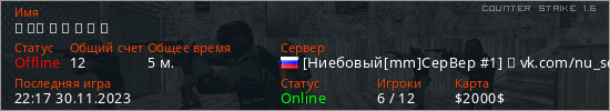Играет на Counter Strike 1.6 сервере. Страна: РоссияПервый раз замечен 22:10 30.11.2023