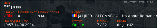 Играет на Counter Strike 1.6 сервере. Страна: РумынияПервый раз замечен 19:00 28.05.2024