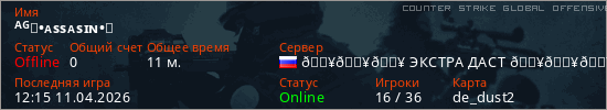 Играет на Counter Strike Global Offensive сервере. Страна: РоссияПервый раз замечен 15:14 10.04.2026