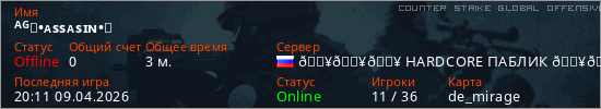 Играет на Counter Strike Global Offensive сервере. Страна: РоссияПервый раз замечен 20:11 09.04.2026