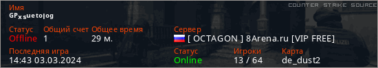 Играет на Counter Strike Source сервере. Страна: РоссияПервый раз замечен 18:52 02.04.2023