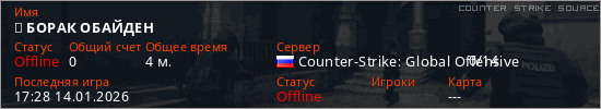Играет на Counter Strike Source сервере. Страна: РоссияПервый раз замечен 17:22 14.01.2026