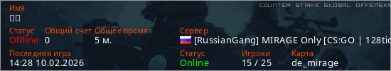 Играет на Counter Strike Global Offensive сервере. Страна: РоссияПервый раз замечен 13:27 10.02.2026