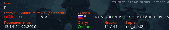 Играет на Counter Strike Global Offensive сервере. Страна: РоссияПервый раз замечен 13:10 21.02.2026