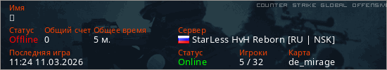 Играет на Counter Strike Global Offensive сервере. Страна: РоссияПервый раз замечен 10:54 11.03.2026