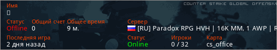 Играет на Counter Strike Global Offensive сервере. Страна: РоссияПервый раз замечен 19:53 11.01.2026