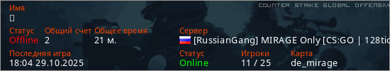 Играет на Counter Strike Global Offensive сервере. Страна: РоссияПервый раз замечен 13:09 16.08.2025