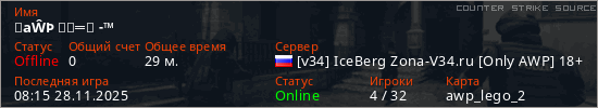 Играет на Counter Strike Source сервере. Страна: РоссияПервый раз замечен 00:32 29.10.2025