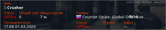 Играет на Counter Strike Source сервере. Страна: РоссияПервый раз замечен 16:32 01.03.2026