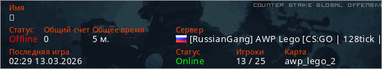 Играет на Counter Strike Global Offensive сервере. Страна: РоссияПервый раз замечен 02:23 13.03.2026
