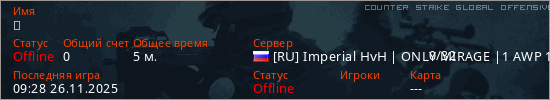 Играет на Counter Strike Global Offensive сервере. Страна: РоссияПервый раз замечен 09:09 26.11.2025