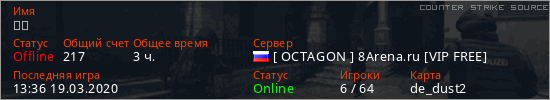 Играет на Counter Strike Source сервере. Страна: РоссияПервый раз замечен 07:42 05.03.2020