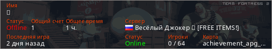 Играет на Team Fortress 2 сервере. Страна: РоссияПервый раз замечен 22:33 11.03.2026