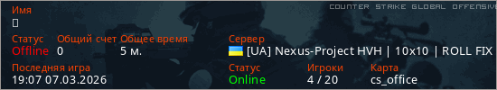 Играет на Counter Strike Global Offensive сервере. Страна: УкраинаПервый раз замечен 19:03 07.03.2026