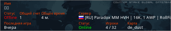 Играет на Counter Strike Global Offensive сервере. Страна: РоссияПервый раз замечен 21:10 24.01.2026