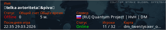 Играет на Counter Strike Global Offensive сервере. Страна: РоссияПервый раз замечен 17:35 29.03.2026