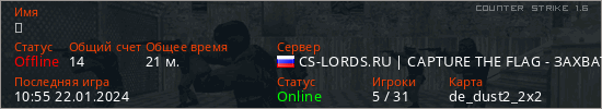 Играет на Counter Strike 1.6 сервере. Страна: РоссияПервый раз замечен 15:53 18.01.2024
