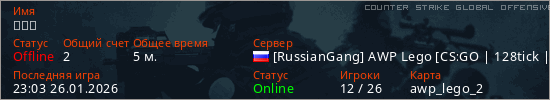 Играет на Counter Strike Global Offensive сервере. Страна: РоссияПервый раз замечен 22:48 26.01.2026